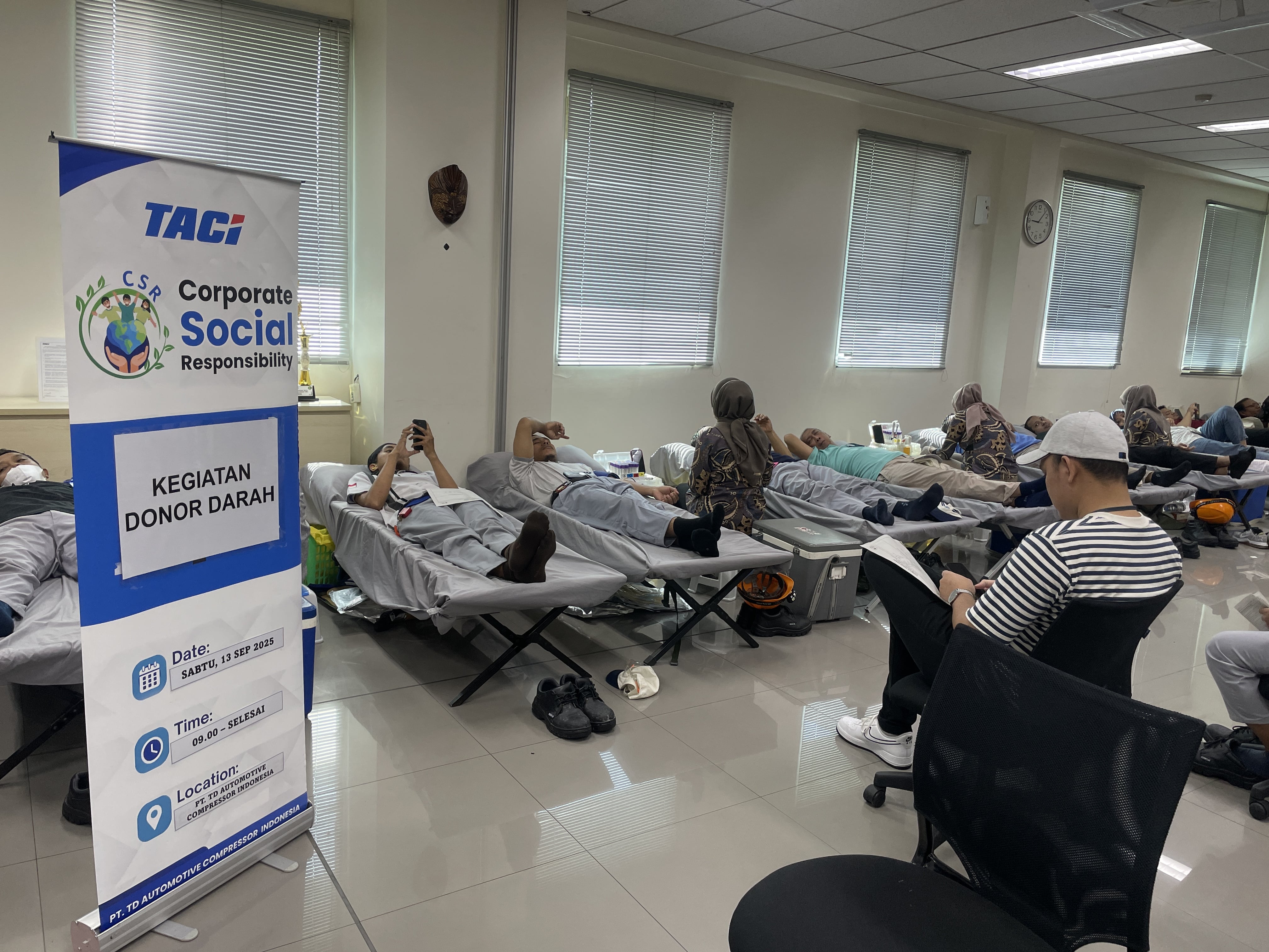 Kegiatan donor darah rutin diadakan setiap 3 bulan sekali dan bekerja sama dengan PMI Kab Purwakarta. Kegiatan ini dilaksanakan pada 13 September 2025 di Conference Room PT TACI dan berhasil mengumpulkan 110 kantong darah.