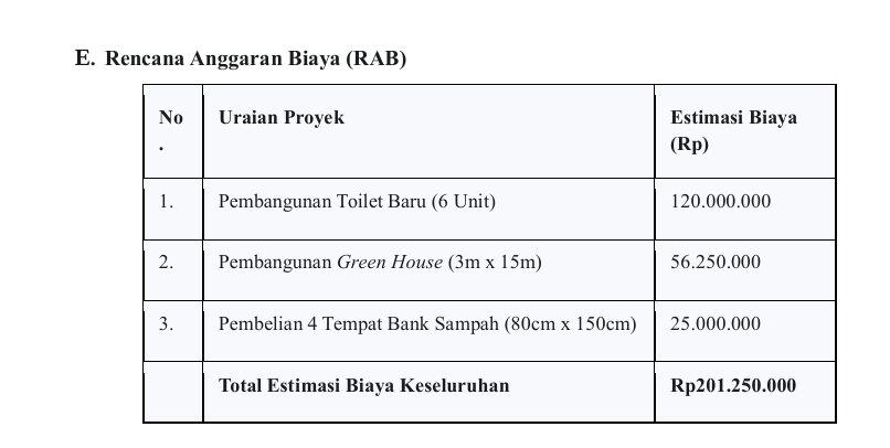 Deskripsi : SMPN 3 CIBARUSAH merupakan Sekolah Adiwiyata Kabupaten Tahun 2025, sebagai penunjang Sekolah Adiwiayata maka dibutuhkan sebagai berikut: 1. Pembangunan Toilet Baru, Pembangunan 6 unit toilet baru (3 unit untuk putra dan 3 unit untuk putri) 2. Pembangunan Green House, 3m x 15m 3. Pembuatan Tempat Bank Sampah, Pembuatan tempat bank sampah permanen dengan rangka besi anti karat (misalnya baja galvanis atau stainless steel) yang kokoh dan tahan lama dengan ukuran 80cm x 150cm.